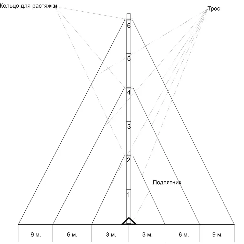 Мачта (6 колен по 1.5 метра), подпятник, метиз для соединения колен, 3 кольца для растяжек (растяжки в комплект не входят)